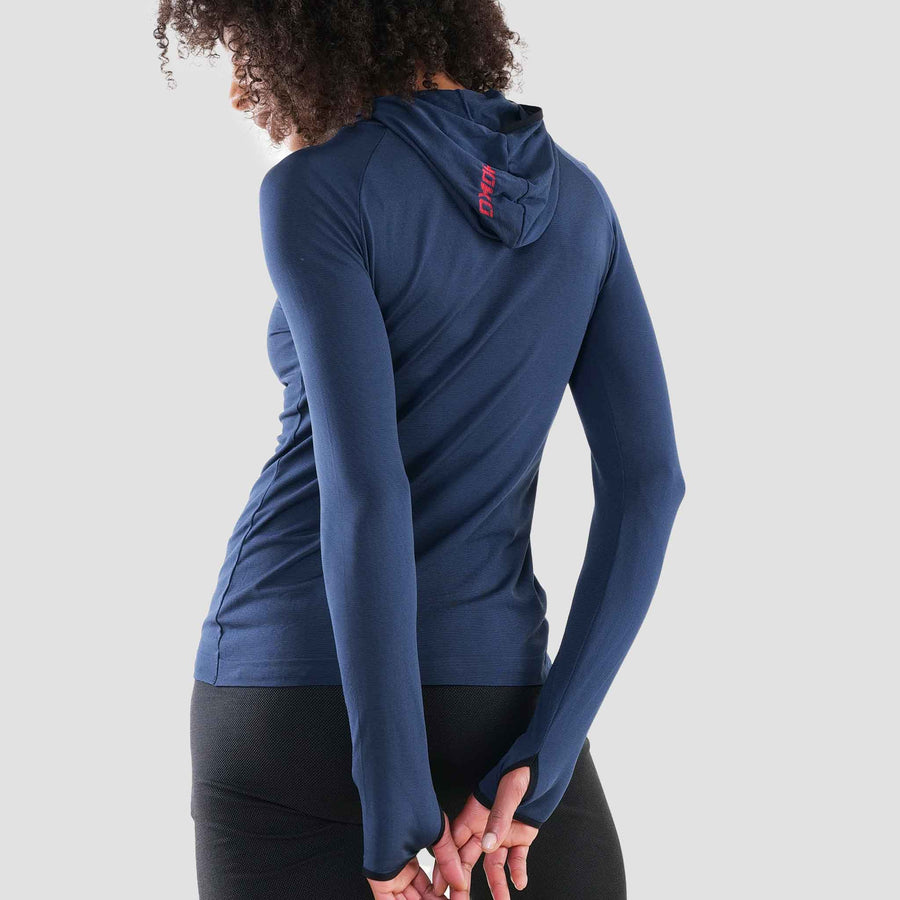 Nikko is a very special garment, one of those that you only realize you are wearing because of how pleasant it is. It is ideal in the middle of the season for before and after training and in the cold season for running or training intensely outdoors. A thin second layer with a hood for women made of 100% polypropylene.